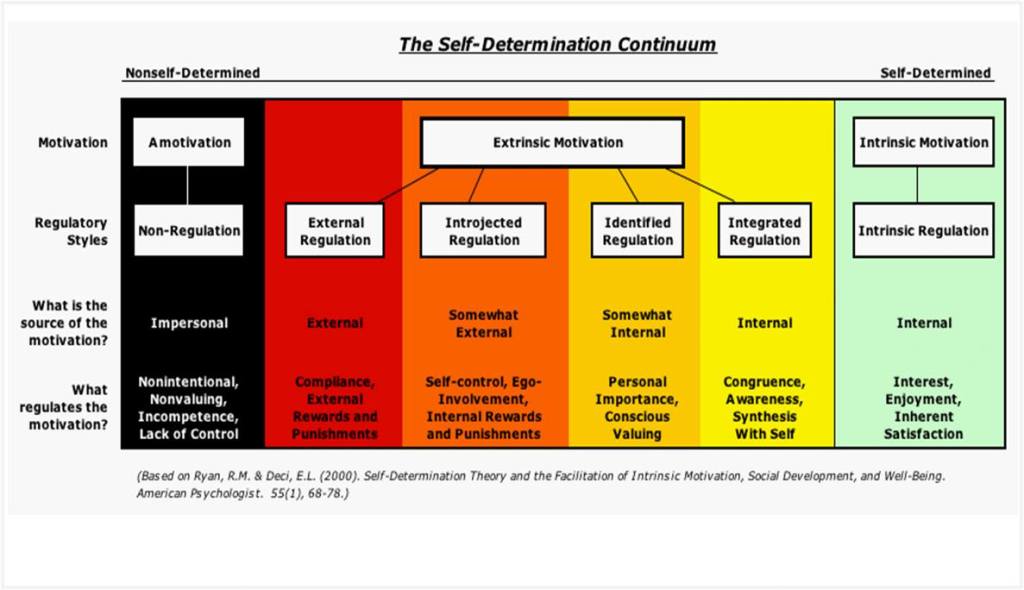 Dalam bukunya “Self-Determination Theory: Basic Psychological Needs in Motivation, Development, and Wellness” Ryan dan Deci mengatakan bahwa untuk mendapatkan puncak performa dan pengalaman terbaik dalam melakukan sesuatu, sesorang harus memiliki motivasi yang berkualitas tinggi. Ini adalah kondisi di mana seseorang mengerjakan sesuatu dengan sepenuh hati. Dan motivasi ini datang dari diri sendiri bukan dari luar. Atau lebih dikenal sebagai motivasi intrinsik. Dalam konteks belajar, anak-anak yang memiliki motivasi intrinsik akan sadar bahwa belajar itu penting dan mereka akan senang belajar dan tidak akan mudah menyerah seperti kasus Nanda dan mungkin juga kebanyakan siswa lainnya.