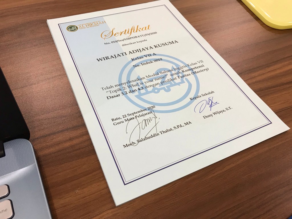 Sertifikat itu masih tertumpuk di meja kerjaku. Sertifikat berwarna biru. Bertuliskan nama anak-anak. Salah satunya nama Fadhil. Entah harus menunggu berapa purnama lagi agar bisa menyerahkan kepada pemiliknya. Menunggu pandemi yang ujungnya masih belum nampak.