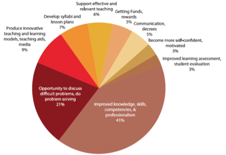 When looking closely at the MGMP’s roles and objectives above, it appears that the MGMP is a means of subject teachers who works collaboratively in broadening their insights and knowledge to create an effective, efficient, enjoyable, and educative learning process. As a professional community of particular subject, the MGMP is expected to solve the problems faced by both teachers in terms of subject characteristics, school environment conditions, curriculum implementation, methodology and adjustments to the development of science and technology. In addition, MGMP also plays a role in improving and equalizing the ability of teachers in preparing, implementing and evaluating the program of teaching and learning activities. According to a survey by Ragatz and Kesuma (2009), by far the most common response of teachers was that MGMP improved their knowledge, skills, competencies, and professionalism. Teachers also confirmed that MGMP was an ideal forum where they can discuss difficult problems and seek solutions. The problems are usually about how to teach a difficult topic to dealing with issues faced in a specific classroom.
